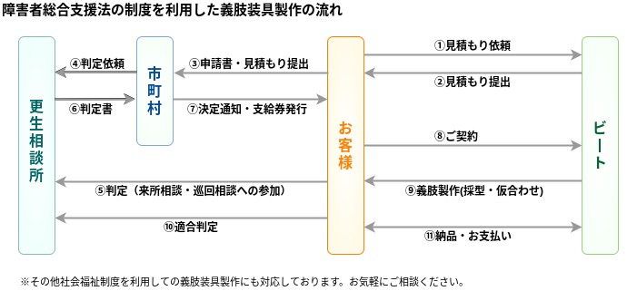 日常生活に使用する義肢装具の製作は、障害者総合支援法などの社会福祉制度を使用して義肢装具を制作することができます。市町村の福祉事務所への申請、更生相談所の相談会への参加といった手続きを踏むことにより、義肢装具を制作することができます。